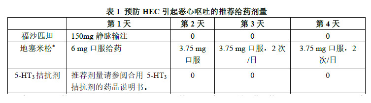 在预防因HEC 所致的恶心和呕吐时,本品、地塞米松和5-HT3 拮抗剂的推荐剂量如表1 所示。本品输注时间20-30 分钟,于第一天化疗开始前30 分钟完成静脉输注给药。